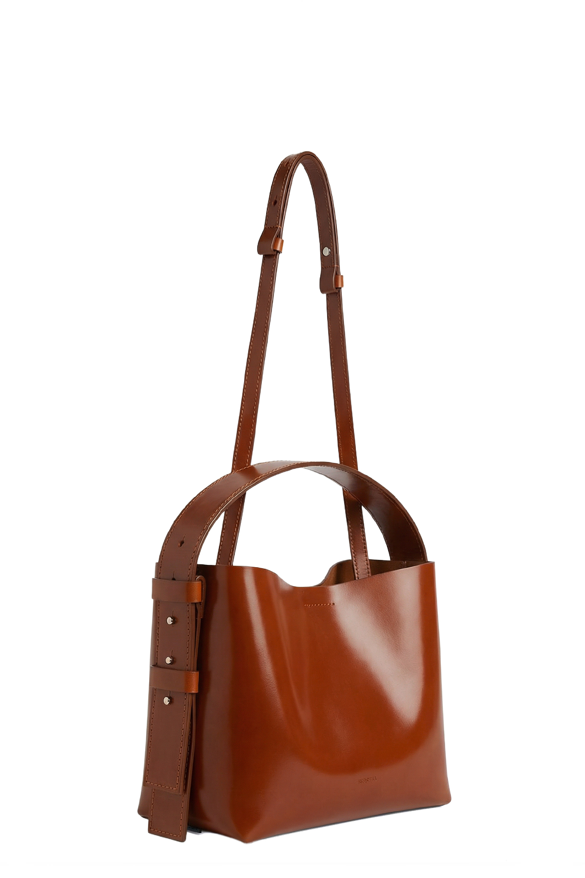 Medium handle and crossbody brown bag. Medium zippered pocket and two compartments inside. Fastened with a magnetic closure. Gold fittings. Embossed acnoum name outside. Dusty bag attached.