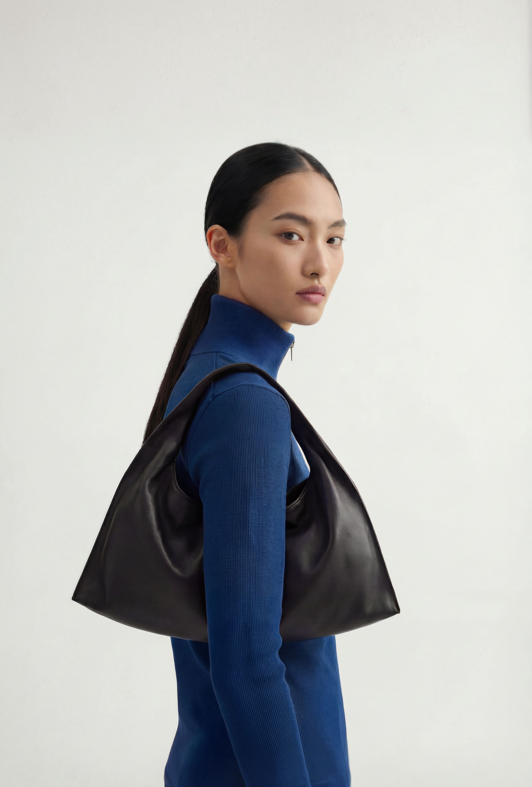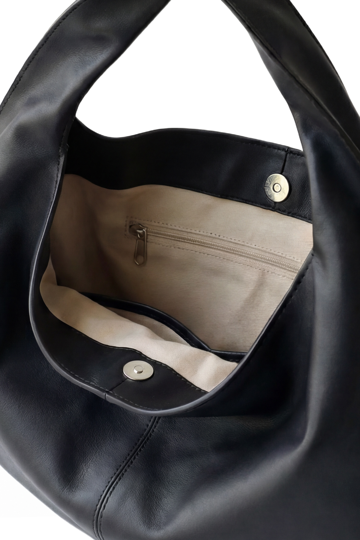 Handle and shoulder black slouchy bag. Pocket inside. Fastened with a magnetic closure. Silver fittings. Embossed acnoum name inside. Handmade in Poland.